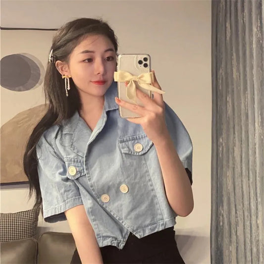 Trendy Korean Style Short Sleeve Denim Jacket | Oversized Vintage Crop Top, Casual Button-Up Denim Coat