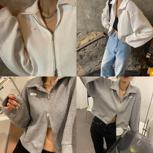 Waffle Knit Zipper Cardigan | Trendy Short Slim-Fit Jacket for Spring & Autumn