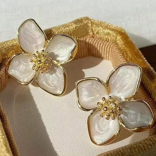 Elegant White Hibiscus Flower Stud Earrings | French Retro Glazed Floral Earrings
