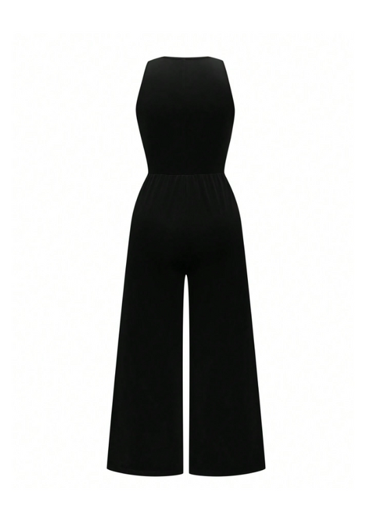Plus Size Elegant V-Neck Sleeveless Jumpsuit – Wide-Leg Cropped Fit with Double Button Detail