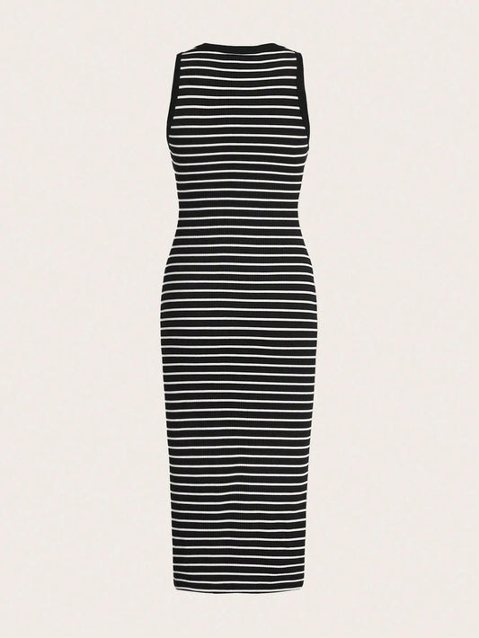 Striped Rib-Knit Bodycon Tank Midi Dress for Women – Casual Slim Fit Sleeveless Everyday Wear