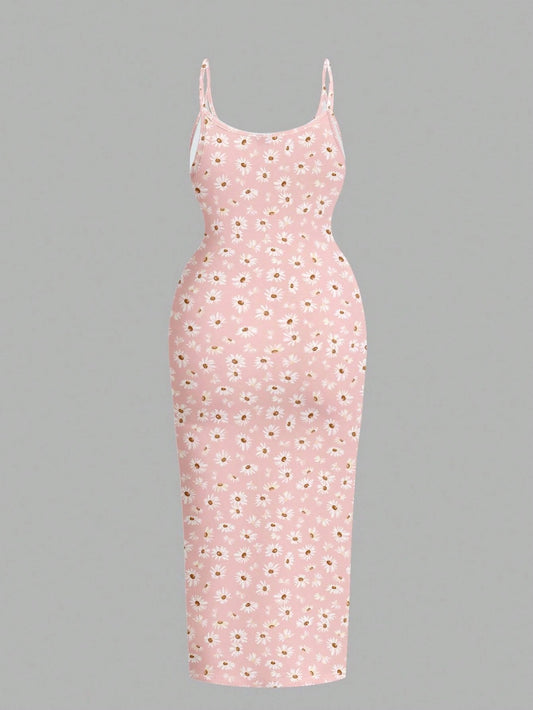 Daisy Print Spaghetti Strap Bodycon Midi Dress – Minimalist Summer Going-Out Style