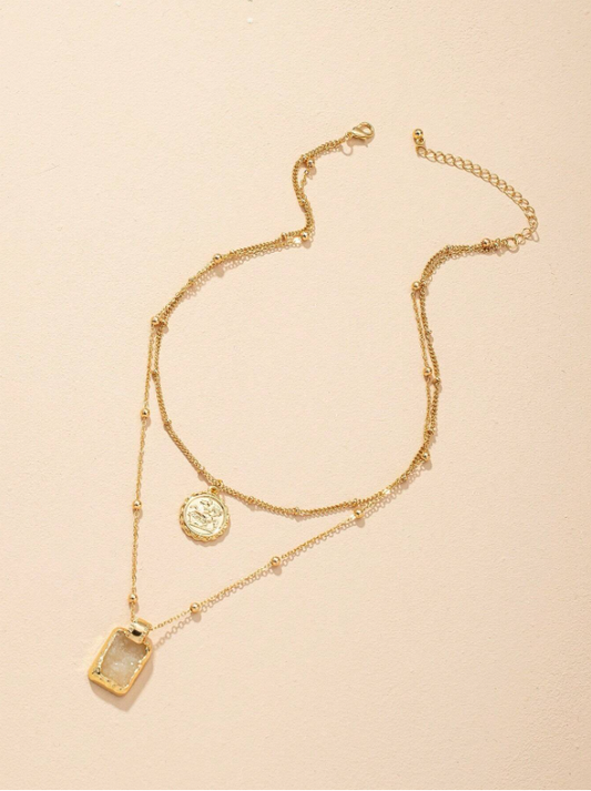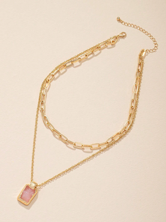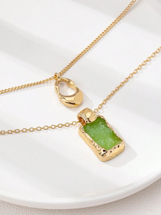 Trendy Geometric Charm Layered Necklace – Double-Layer Pendant with Rhinestone & Gemstone Accents