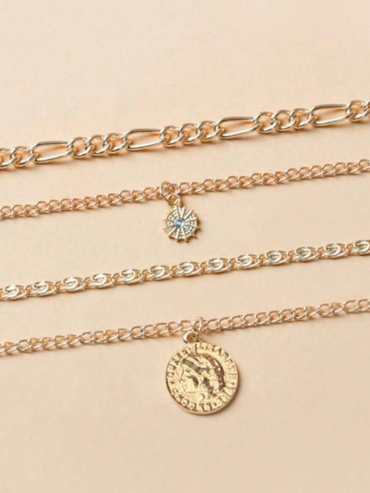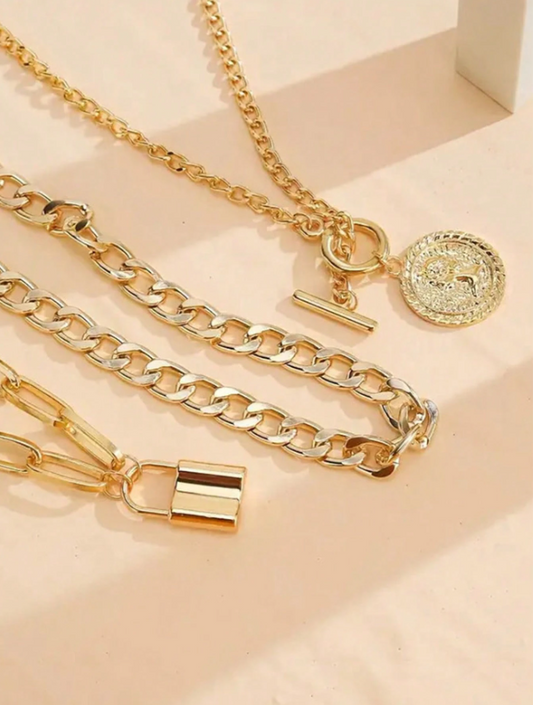 4pcs Chain Necklace Set with Rhinestone Safety Pin & Lock Charm – Gold & Silver Layered Chains for Daily & Party Looks