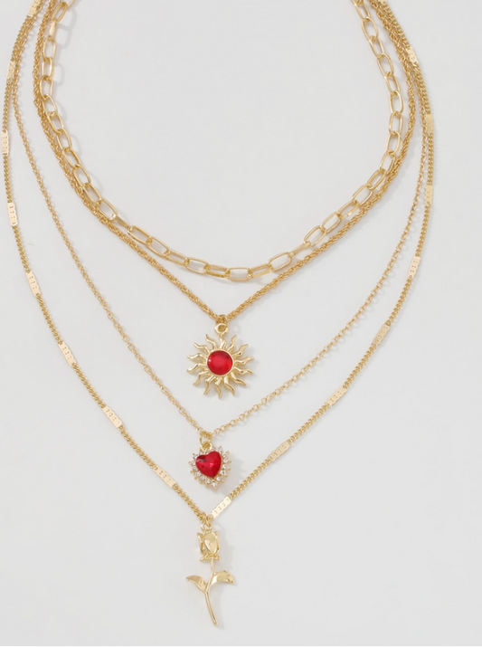 Layered Heart & Rose Flower Pendant Necklace – Gold-Tone Multi-Layer Chain