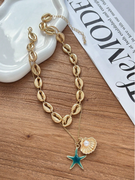 Boho Stars & Seashell Layered Necklace Set – Gold Multi-Chain Beach Style for Vacay & Party Looks