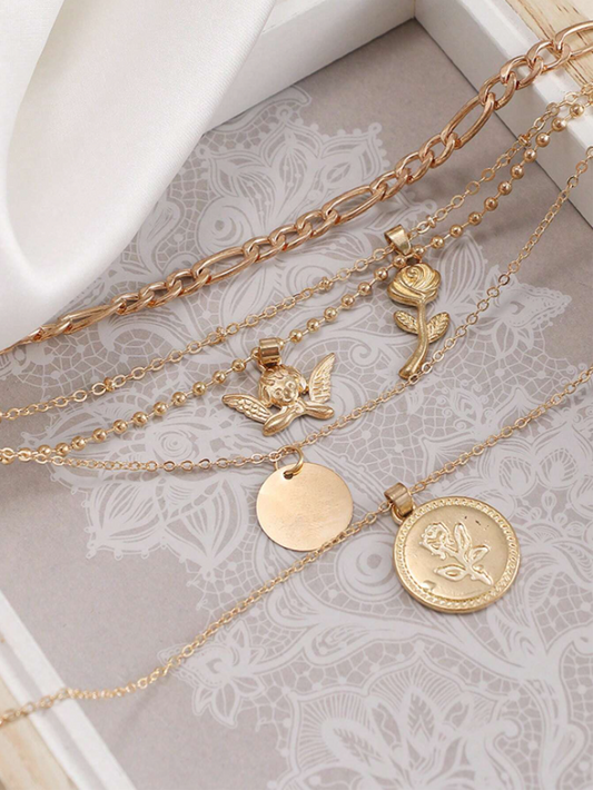 Rose & Angel Layered Pendant Necklace – Gold Multi-Chain