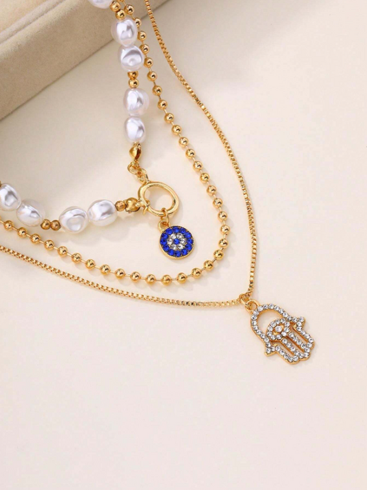 Evil Eye & Hamsa Charm Layered Necklace – Gold Old Money Style with Rhinestones & Pearl Accents