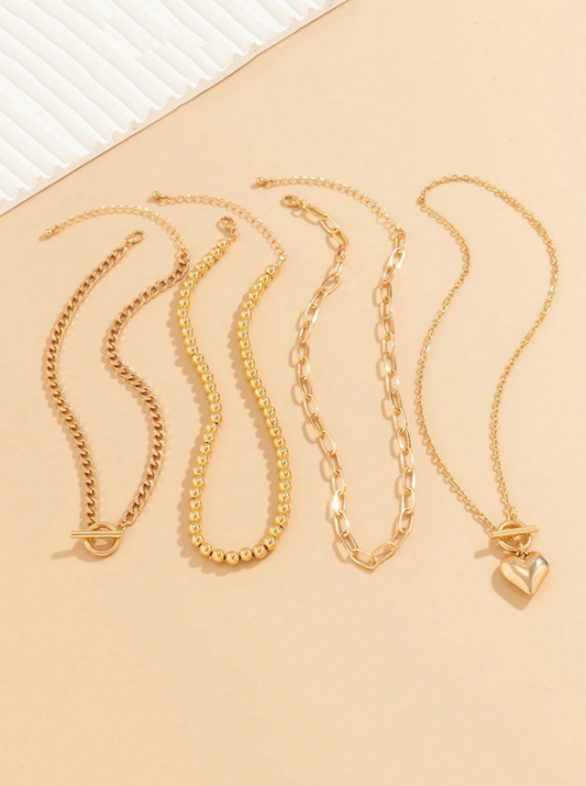 4-Piece Gold Layered Heart Pendant Necklace Set for Women – Stackable, Beaded & OT Clasp Chains