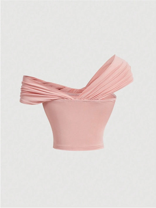 Pink Knit Fashionable Casual Ruched Asymmetrical Neckline Tight Cropped T-Shirt