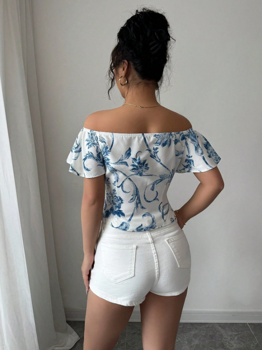 Floral Off-Shoulder Ruffle Trim Blouse – Slim Fit Casual Summer Top for Vacation & Everyday Style