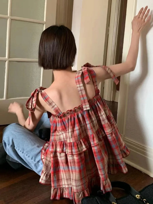 Trendy Korean Style Sleeveless Crop Top for Women | Red Checkered Off-Shoulder Summer Blouse | Casual Cute Aesthetic