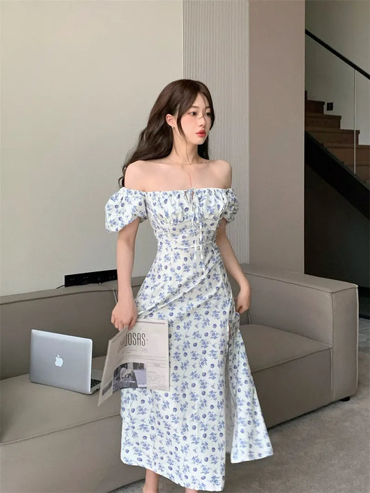 French Blue Floral Off-Shoulder Midi Dress – Puff Sleeves, Empire Waist, Cottagecore Summer Vibe