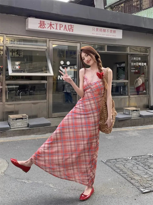 Korean Style Plaid Slip Dress – Long Casual Cami Dress with Plunge Neck & Sleeveless Fit