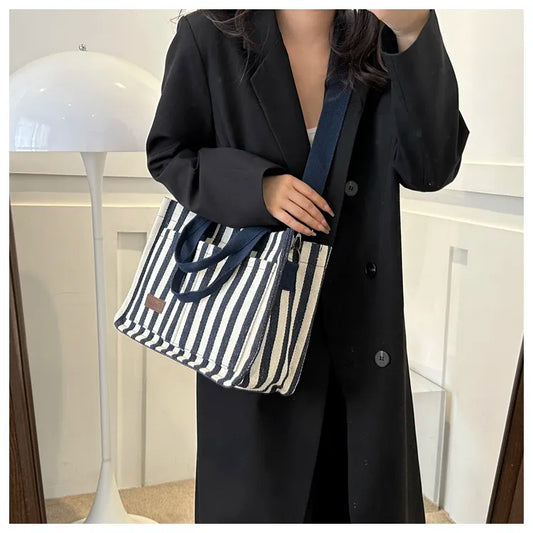 Style Canvas Tote Bag – Large Capacity Striped Shoulder Bag for Travel, Work & Daily Use