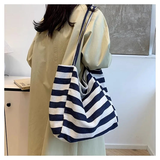 Striped Canvas Large Capacity Tote Bag – Elegant Casual Shoulder Handbag for Work, Travel & Daily Use