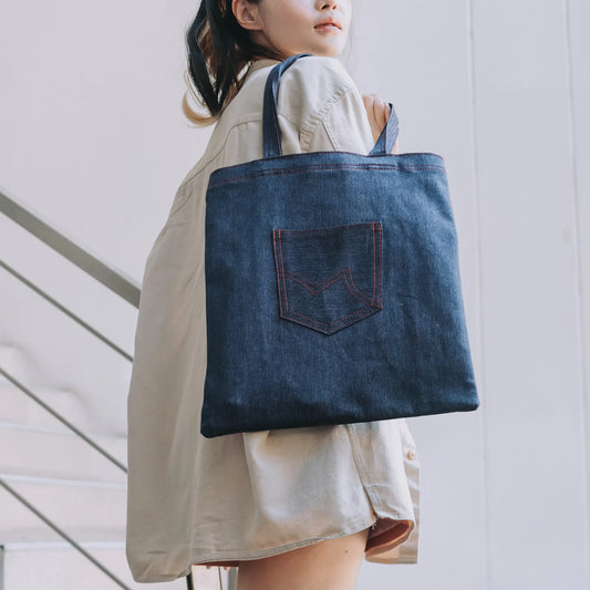 Reversible Denim Shoulder Tote Bag – Large Capacity Fashionable Two-Way Jeans Bag with Pocket
