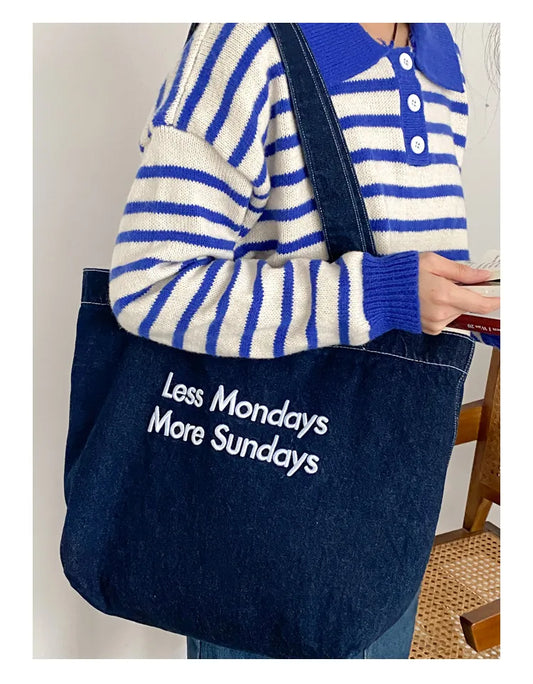 Denim Shoulder Tote Bag – Large Capacity Canvas Jeans Bag with Embroidered Quote