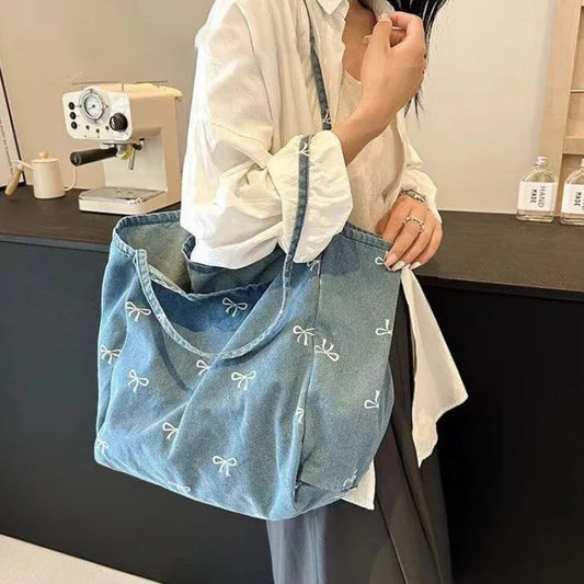 Denim Shoulder Tote Bag – Large Bow Print Jeans Bag