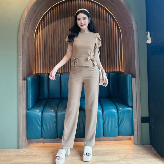 Wool Wave Co-ord Set with Rose Sleeve Bow Top & Wide-Leg Pants | Trendy Two-Piece Outfit