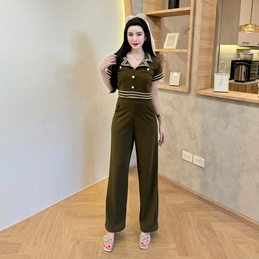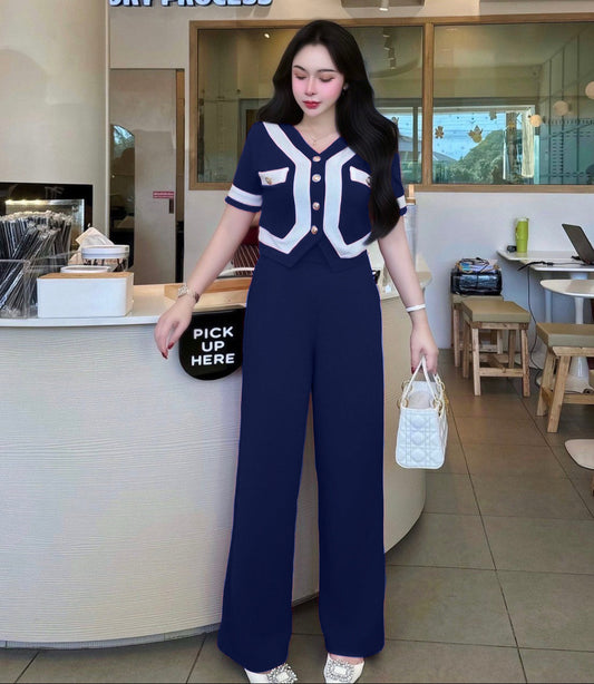 Chic Pearl-Button Wool Co-ord Set – Suit-Style Top & Tailored Pants with Pockets