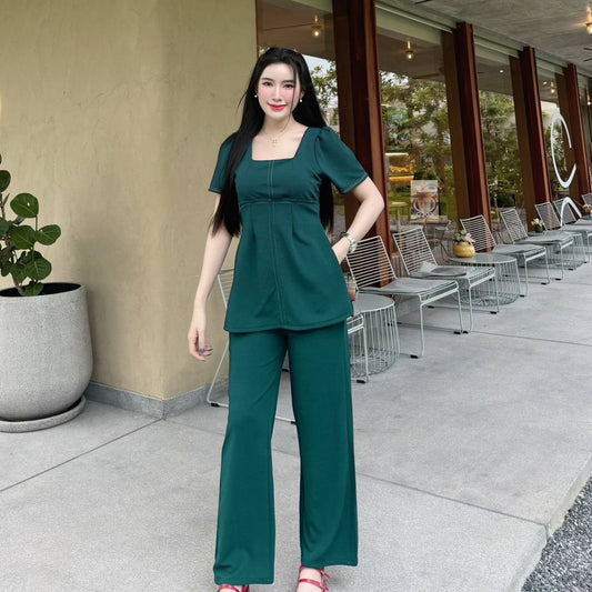 Trendy Wool Wave Fabric Set - Square Neck Side Slit Top & Matching Pants