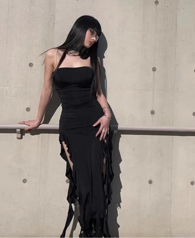 Make a fierce fashion statement with this black strapless bodycon tube dress, designed for bold Gen Z and millennial trendsetters. Featuring a form-hugging silhouette, dramatic asymmetrical ruffle hem, and edgy bandeau neckline, this solid black dress is your go-to for clubbing, night outs, and Instagram-worthy party moments. Crafted from a polyester blend for a snug yet breathable fit, this opaque dress adds a confident edge with no lining and sleek styling. Pair with knee-high boots or heels to complete your fashion-forward look. Perfect for weekend plans, fashion events, or your next glam moment.