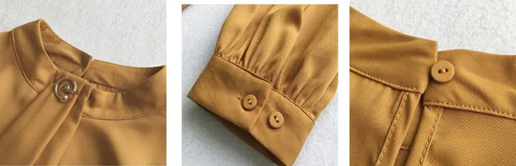 Elevate your 9-to-5 and beyond with this stylish chiffon office shirt for women featuring elegant 3/4 sleeves and a built-in tie detail. Designed with a flattering regular fit and a classic shirt collar neckline, this blouse brings sophistication to your workwear wardrobe while staying breathable and lightweight. Available in Cream, Mustard Yellow, and Slate Green, this versatile top is perfect for office meetings, formal events, and everyday smart casual outfits. A must-have for modern women looking for affordable, polished, and Instagram-worthy fashion with a professional twist.