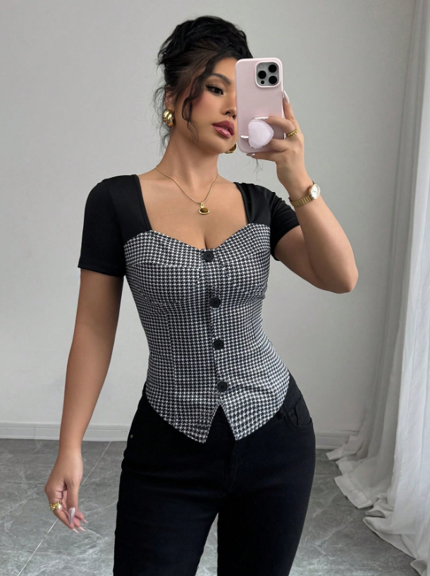 Elevate your everyday style with this chic women’s short sleeve T-shirt, designed for an effortlessly elegant look. Featuring a classic plaid gingham pattern in black and navy blue, this slim fit top comes with a flattering square neckline and stylish front button detail. Crafted from soft, medium-stretch knitted fabric, it ensures all-day comfort and a figure-enhancing silhouette. The asymmetrical hem adds a trendy twist, making it perfect for casual days, office wear, or smart-casual outings. Easy to maintain with machine wash care, this Insta-worthy wardrobe staple is ideal for Gen Z and millennial women who love modern fashion with a touch of sophistication.