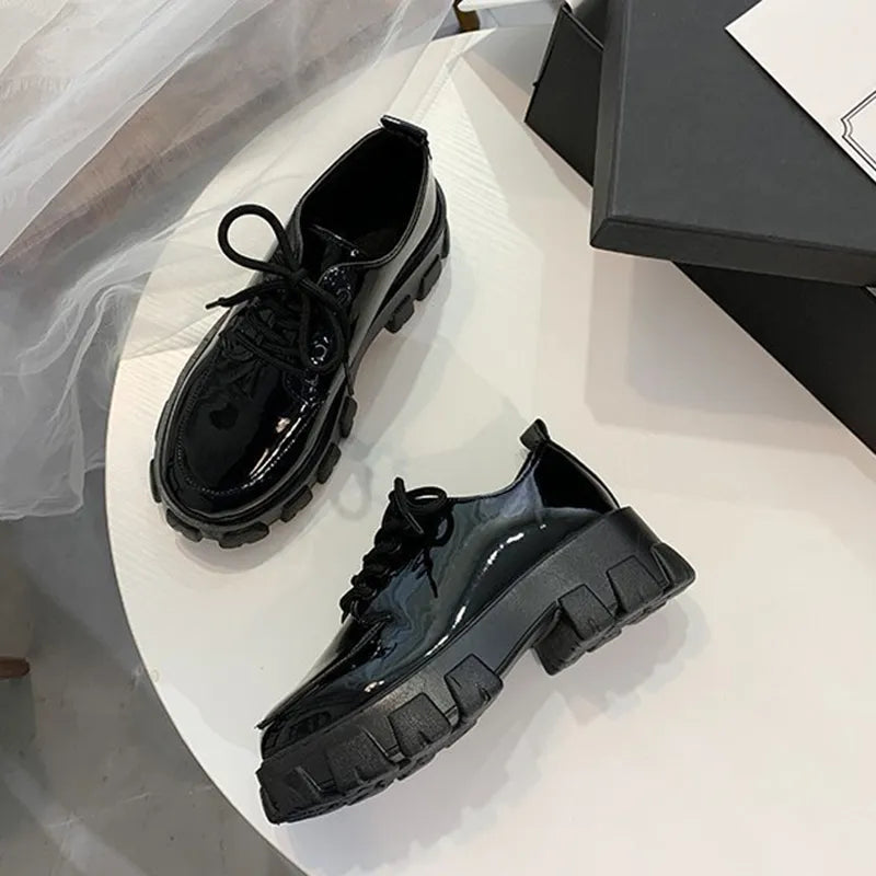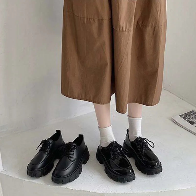 Chunky Platform PU Leather Lace-Up Shoes for Women – Mirror & Matte Black JK Style Loafers