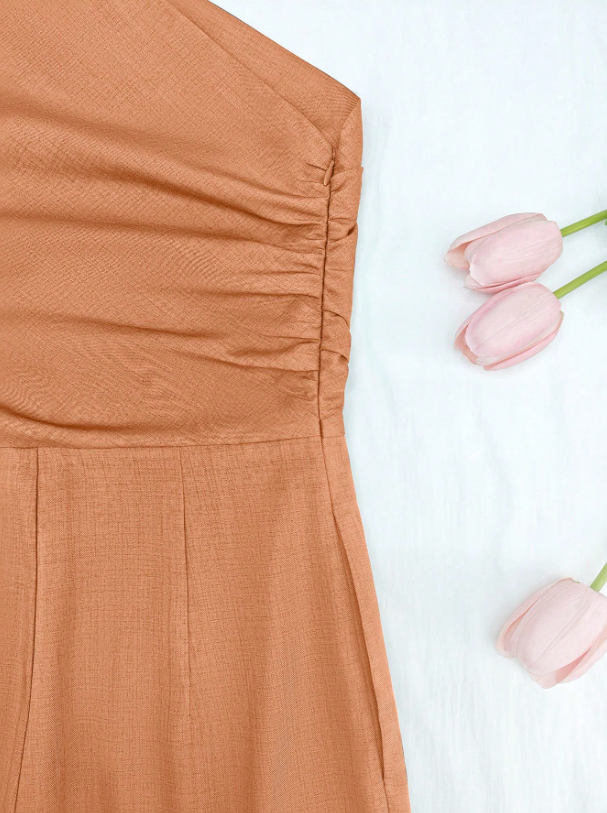 Make a bold statement in this ultra-chic asymmetric one-shoulder jumpsuit, designed for fashion-forward women who love minimalist elegance. With a high-waisted silhouette, ruched pleats, and a flattering regular fit, this extra-long jumpsuit flatters every curve while keeping things sleek. Crafted from premium woven fabric with a blend of 95% polyester and 5% elastane, it's sleeveless, unlined, and features a clean zip closure at the back. Available in 9 vibrant solid colors—brown, black, grey, khaki, green, orange, purple, navy blue, and yellow—this non-stretch party-ready one-piece is perfect for brunch, dinner dates, semi-formal events, or any Insta-ready moment. Machine washable for easy care.