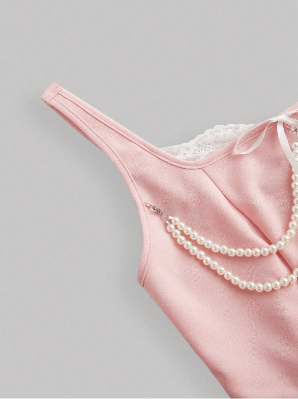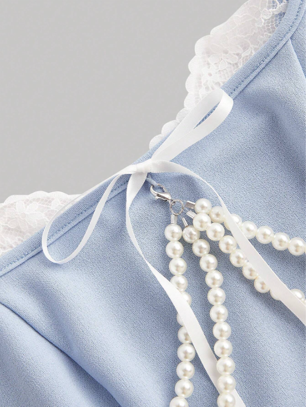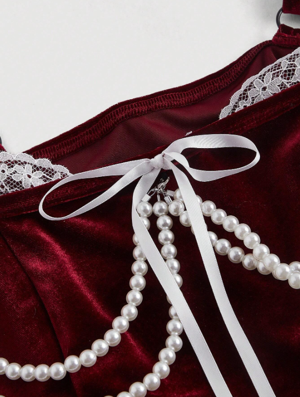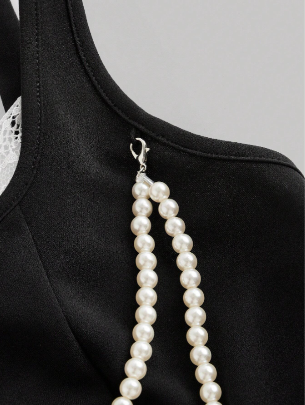 Level up your party outfits with this chic velvet-inspired sleeveless tank top, designed with a detachable lace collar, pearl bow, and delicate chain accents for that extra glam. Featuring an asymmetrical hem, slim fit silhouette, and slight-stretch fabric, this statement camisole is your go-to for everything from New Year’s Eve to a rooftop soirée. Available in trending colors like baby blue, burgundy, black, and pink, it’s crafted in soft polyester-elastane blend knit—perfect for Gen Z and millennial girls who love to slay in retro elegance, without compromising comfort or budget. Pair it with wide-leg pants, leather skirts, or heels for a polished party-ready look.